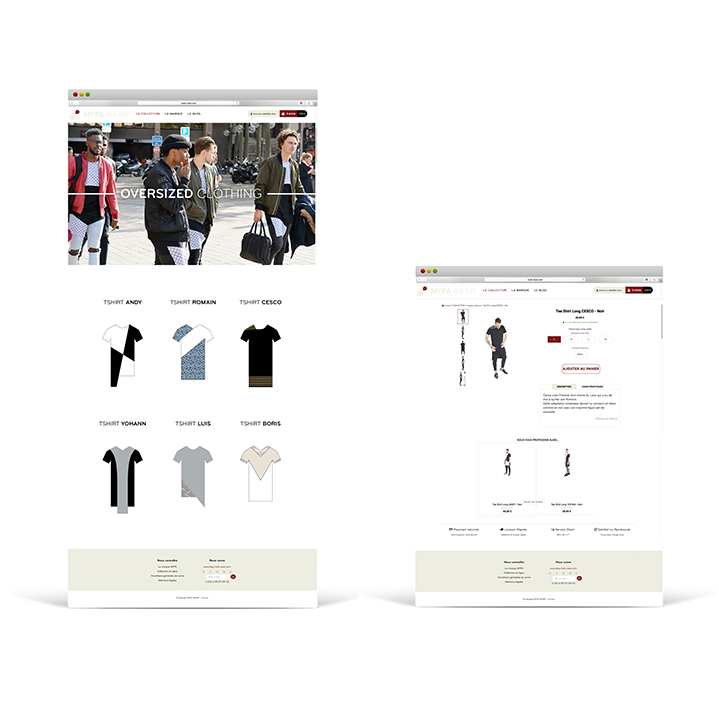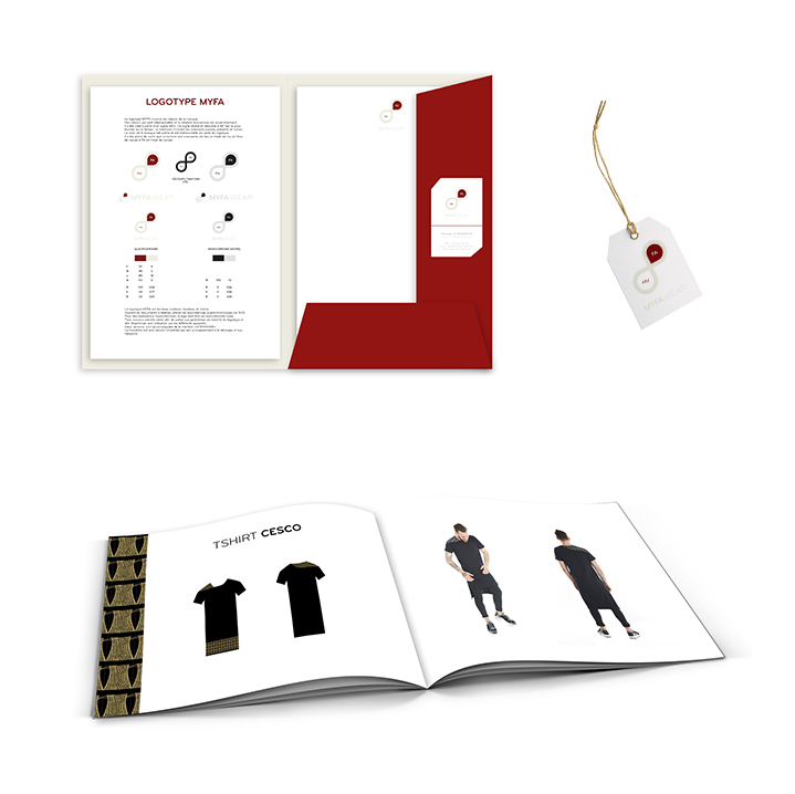 Identité visuelle d'une marque de vêtements. Création de la charte graphique dont le logotype, la papeterie, un catalogue des produits et le webdesign.